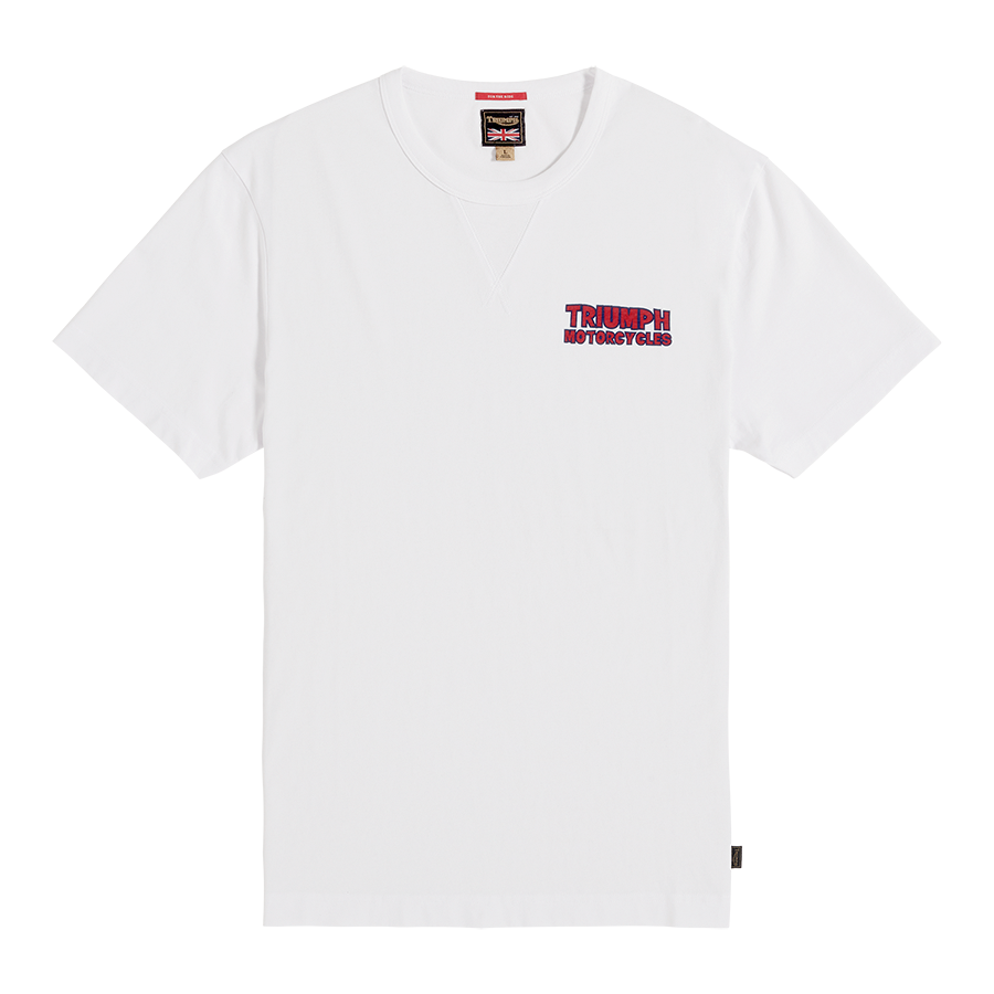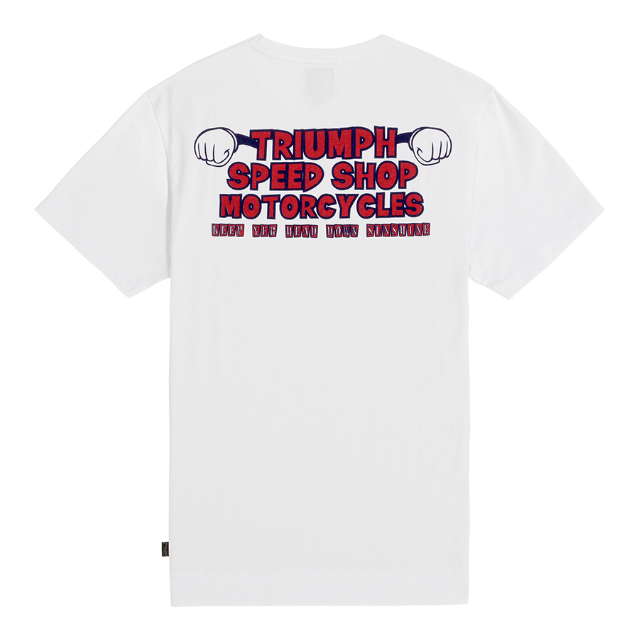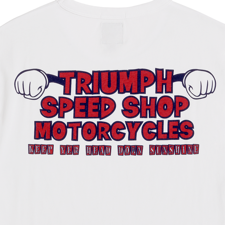 A classic fit tee with small stylized "Triumph Motorcycles" text on the front and "Head Down Speed Shop" back graphic.